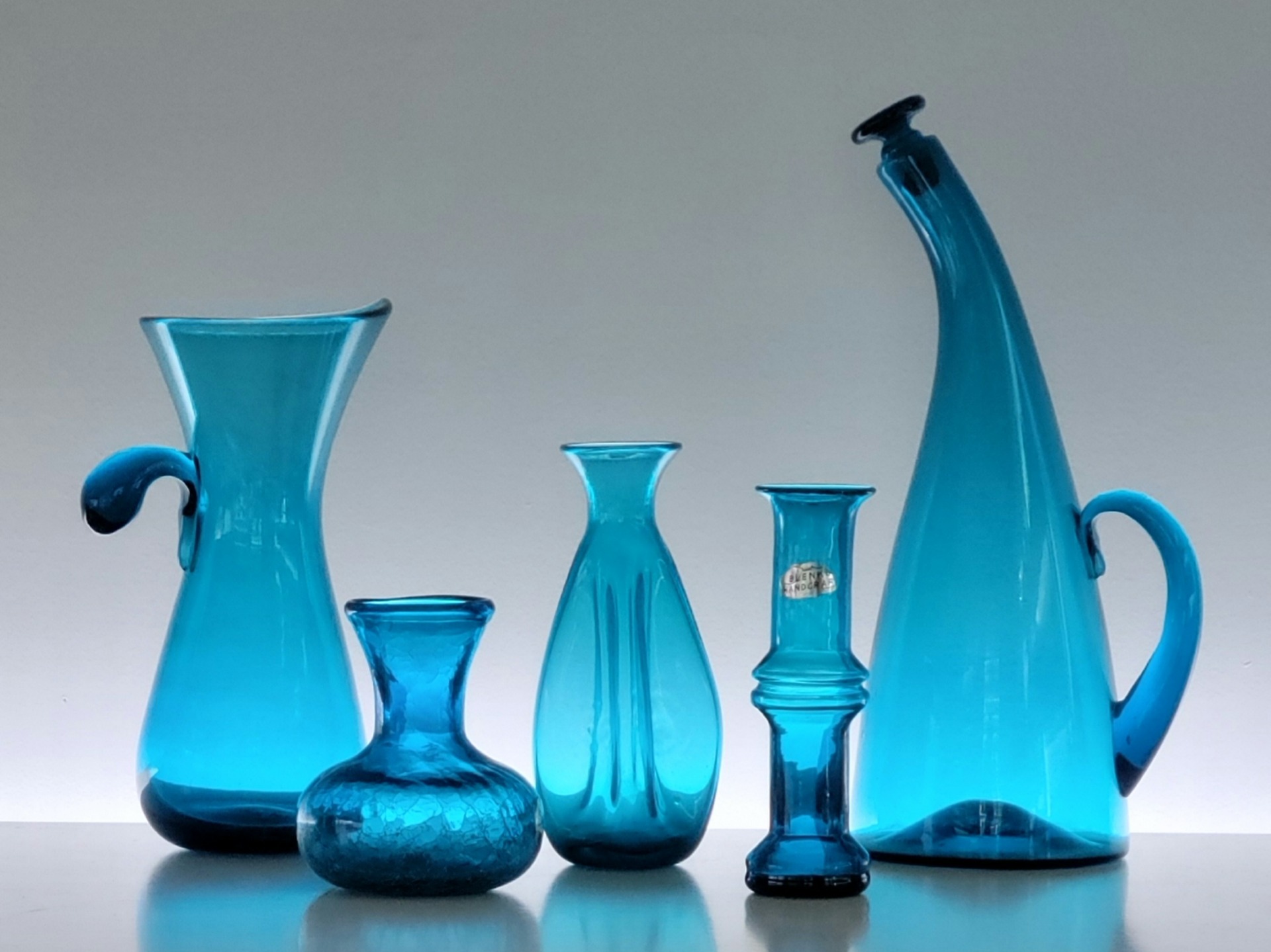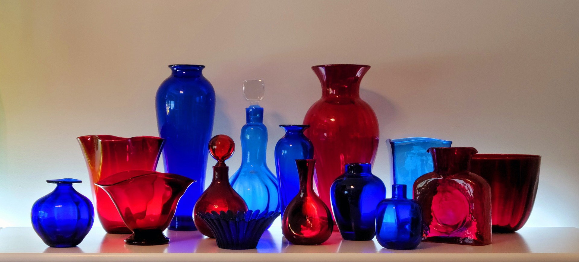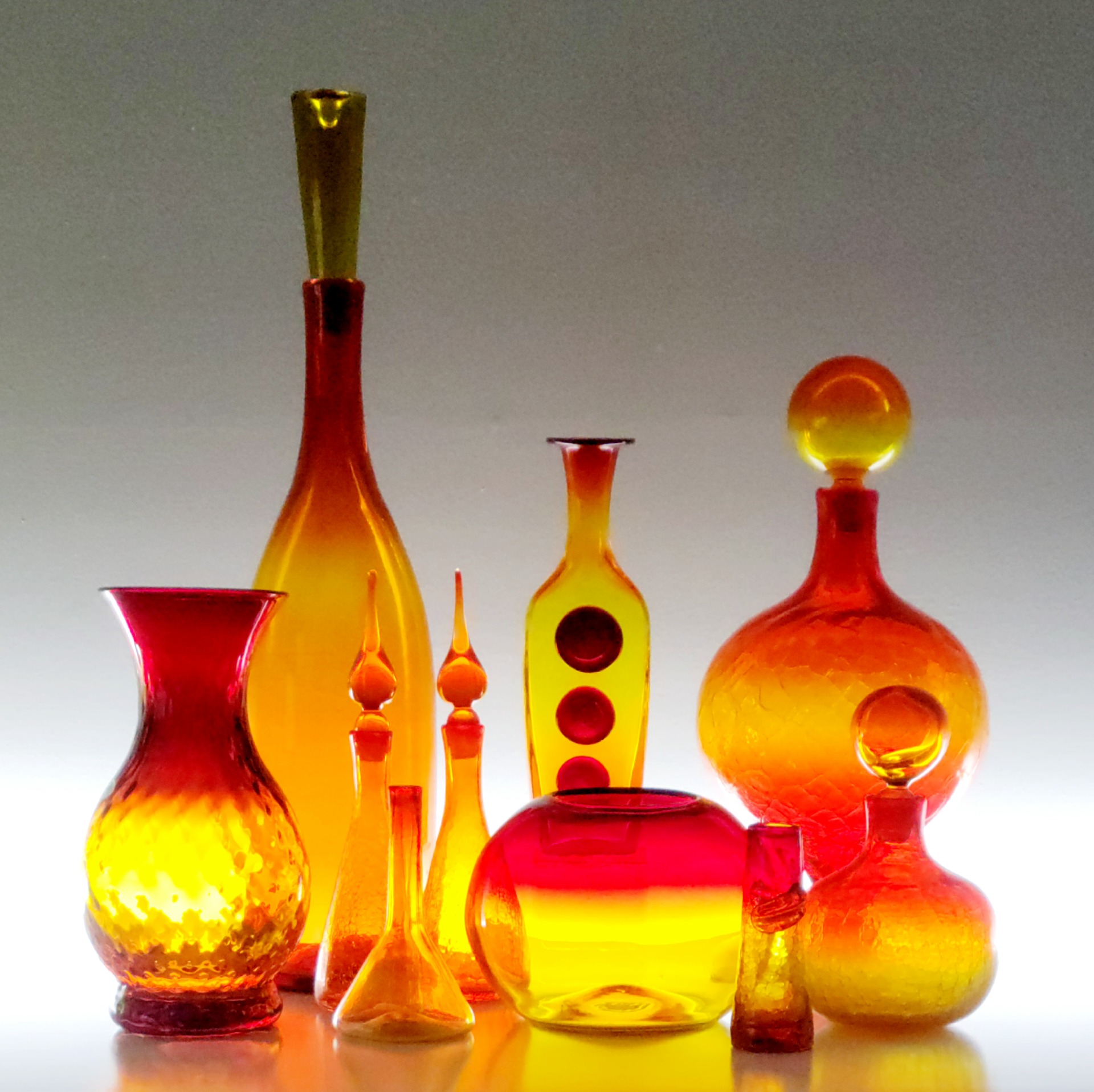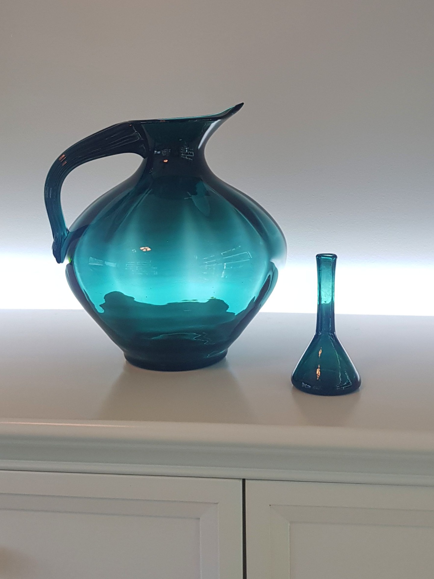 this image contains 3 non-Blenko pieces, purchased by mistake, but I love them enough to keep. 2 Pilgrim cruets and a Rainbow button vase.