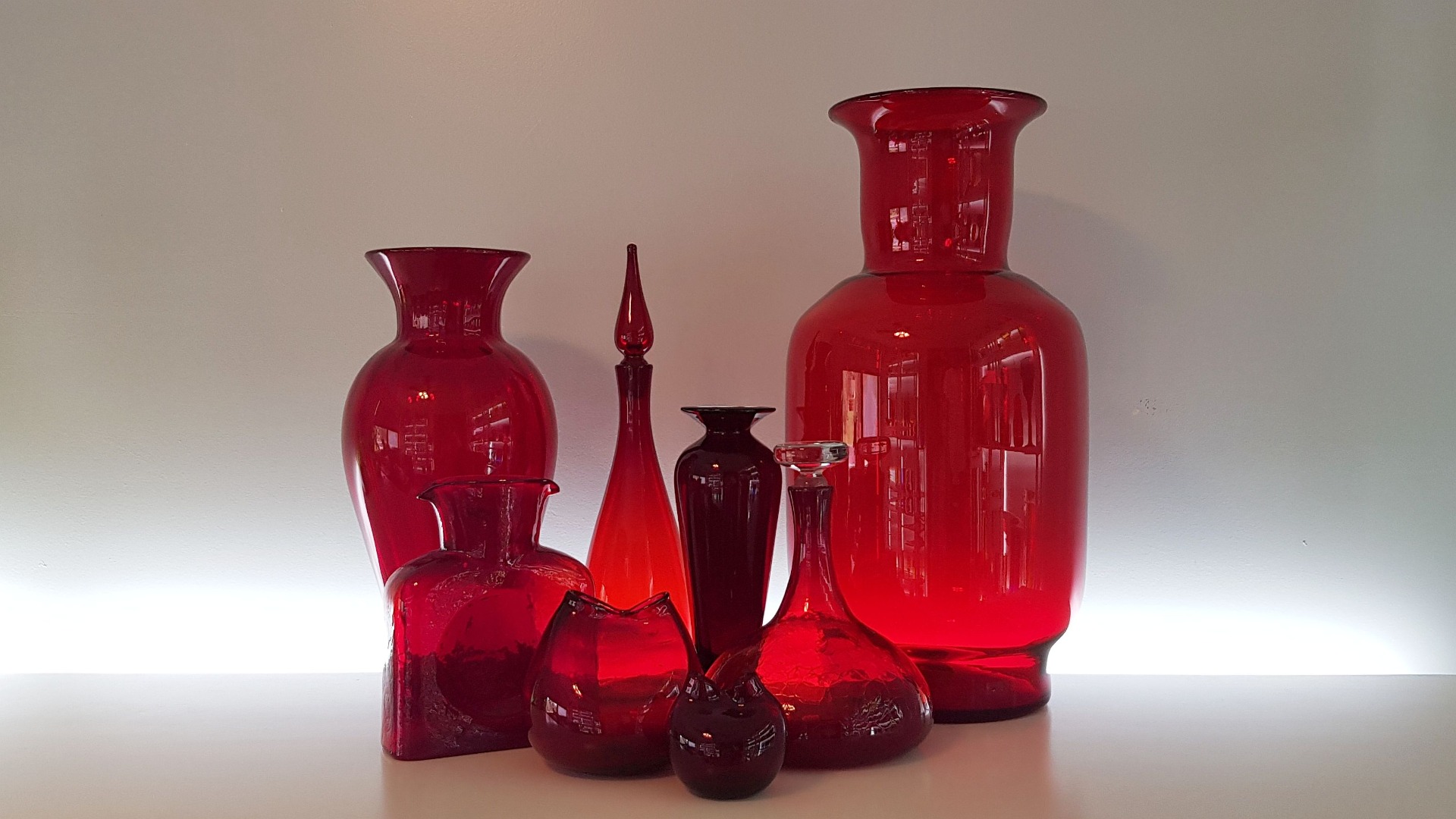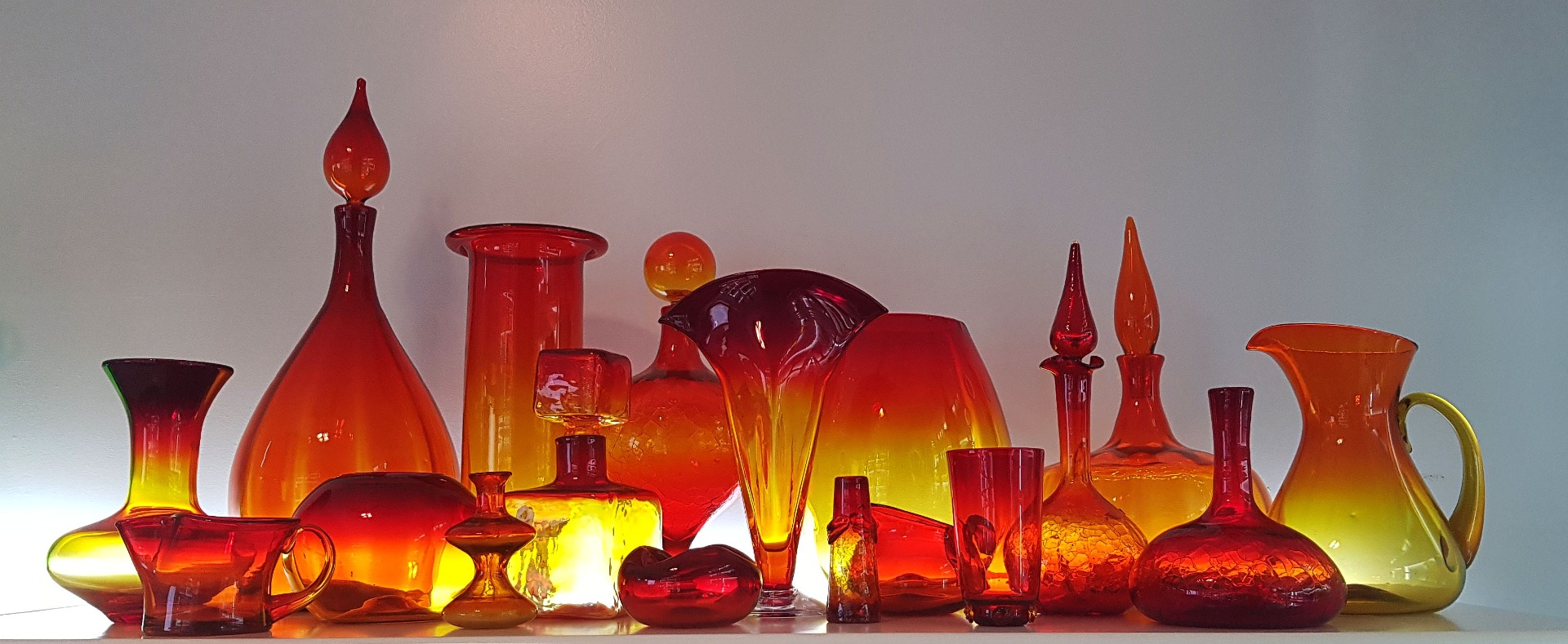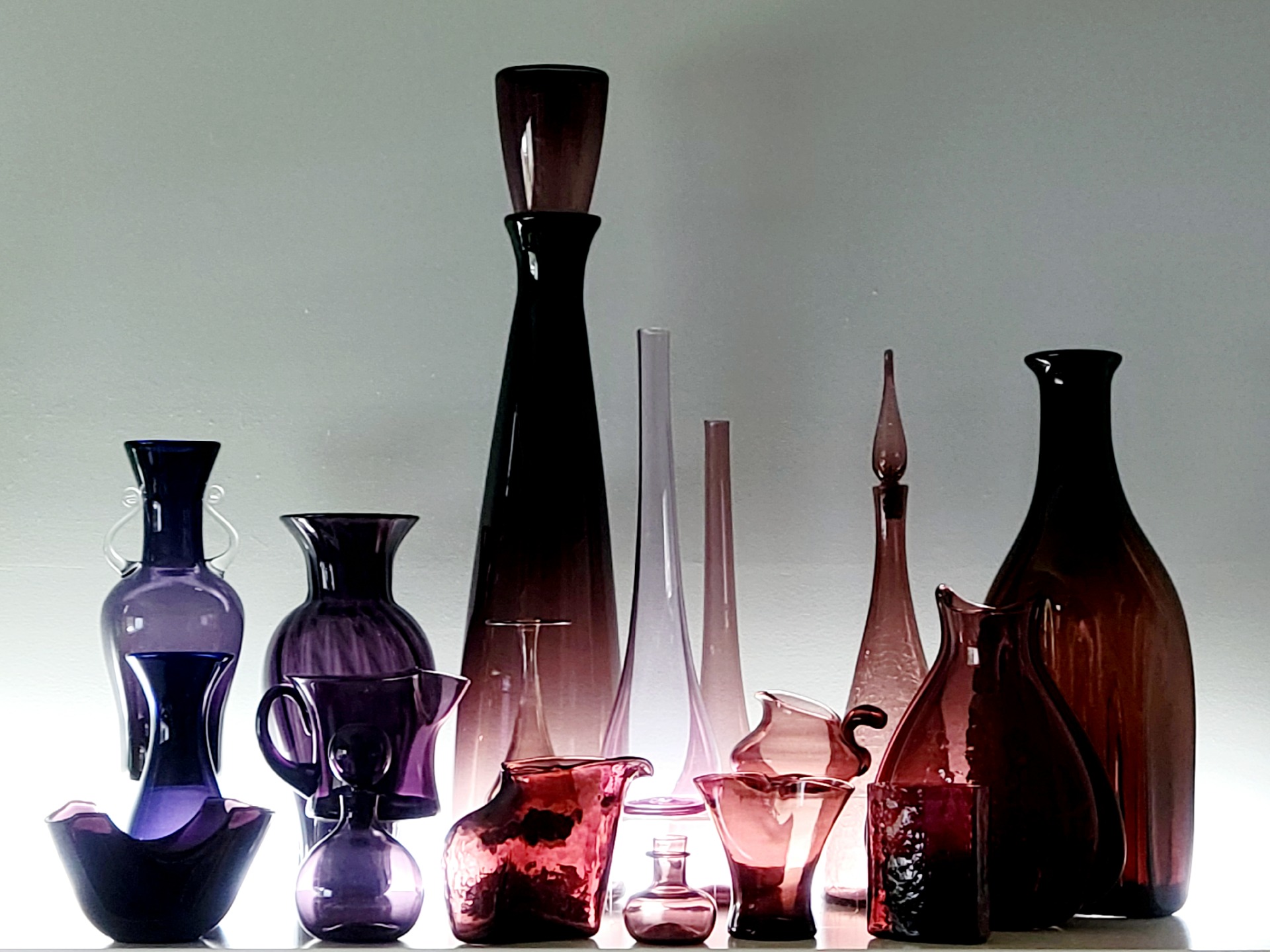 this image contains 3 non-Blenko pieces, purchased by mistake, but I love them enough to keep. 2 Pilgrim cruets and a Rainbow button vase.