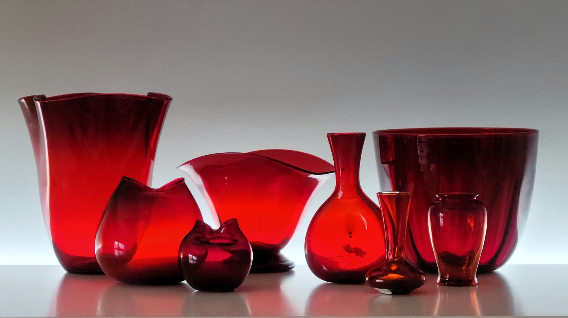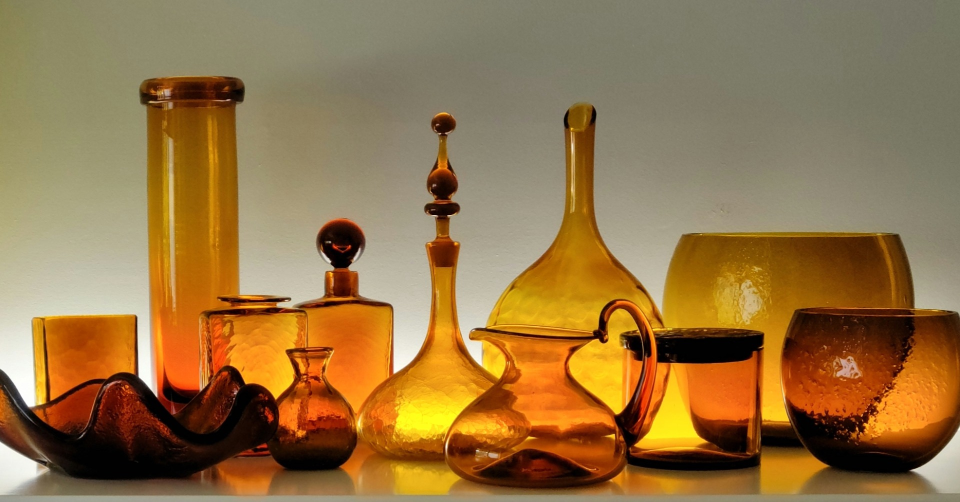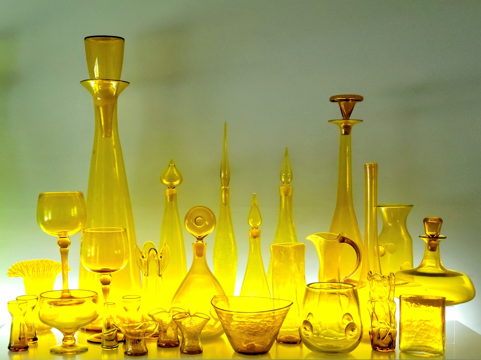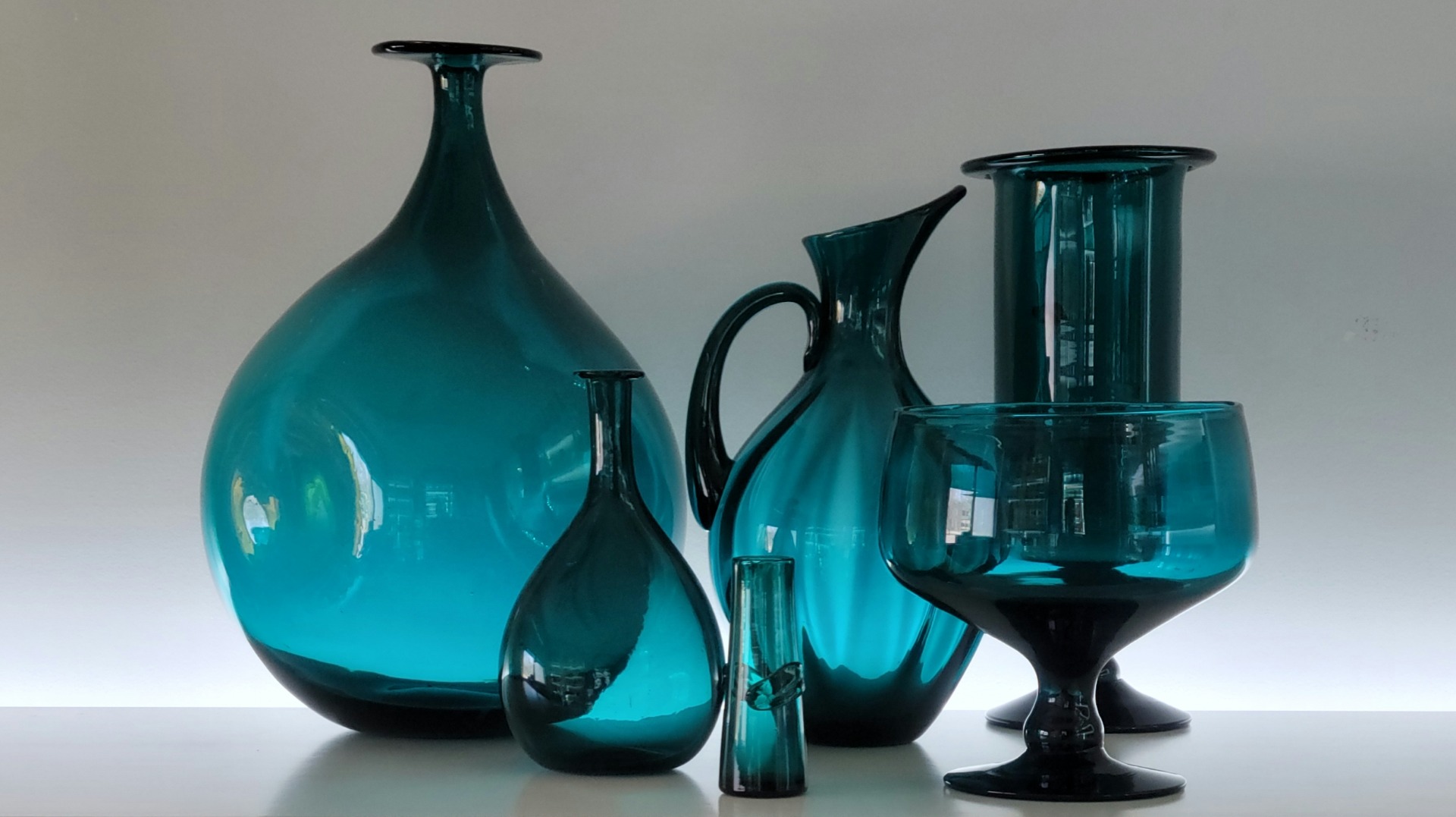 this image contains 3 non-Blenko pieces, purchased by mistake, but I love them enough to keep. 2 Pilgrim cruets and a Rainbow button vase.