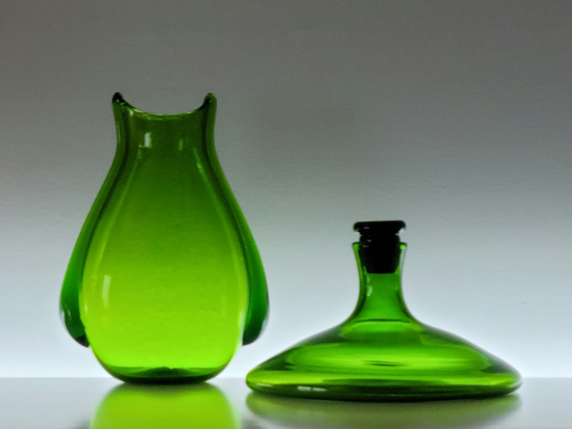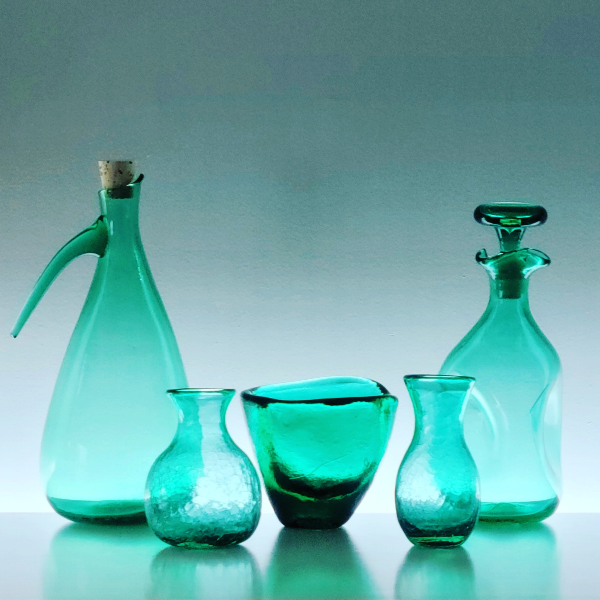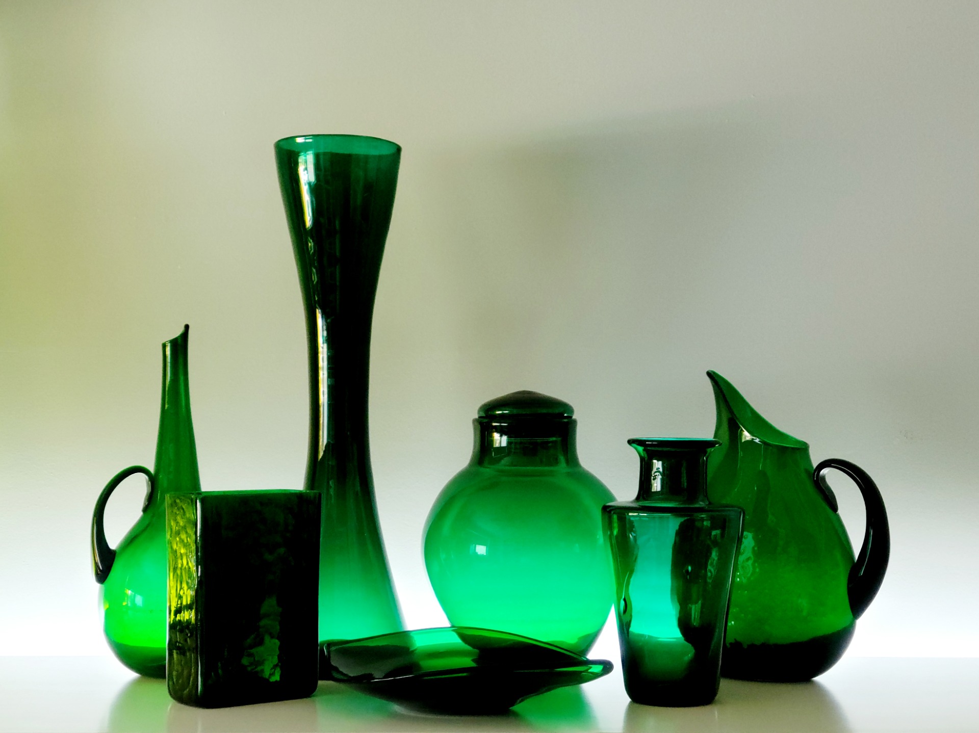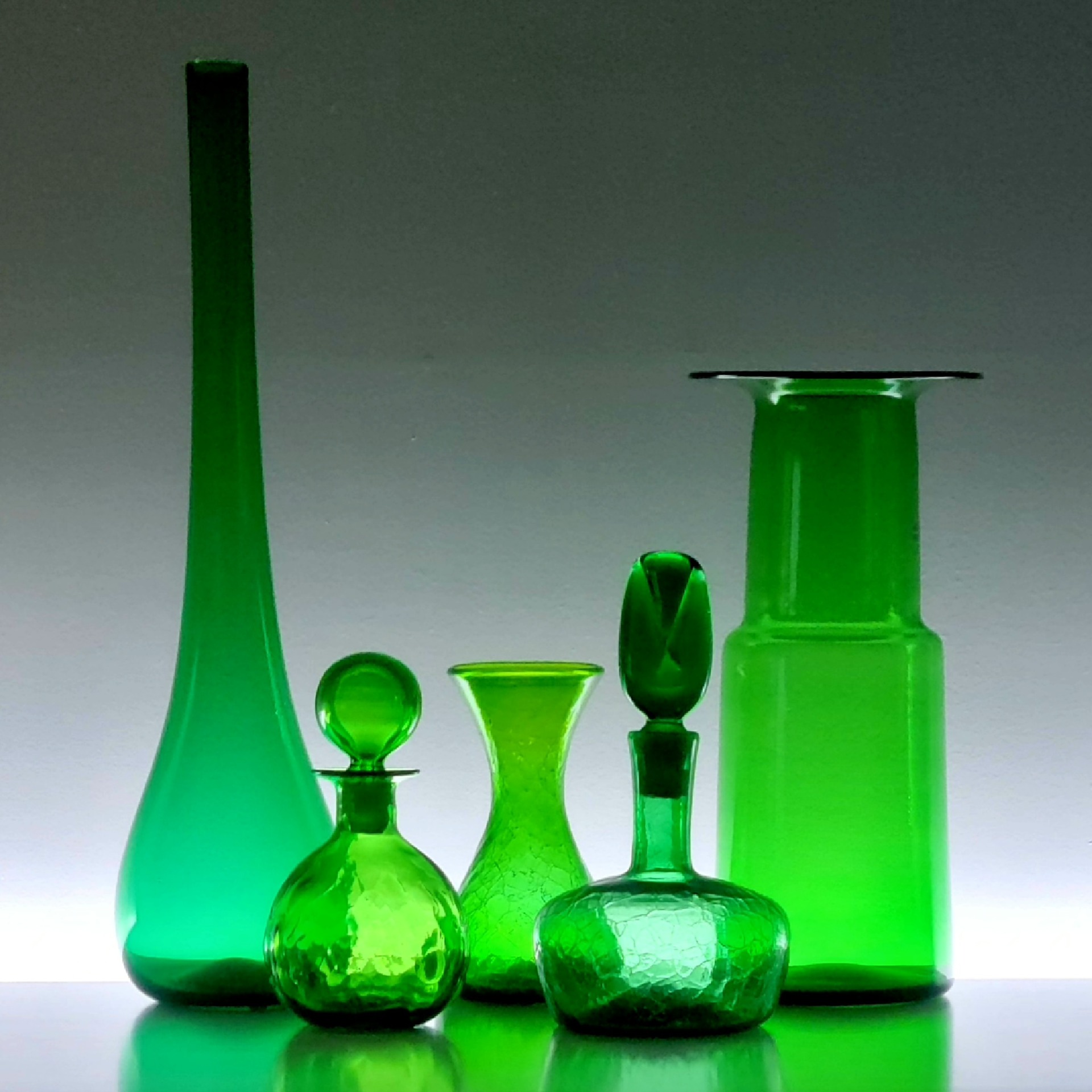 5616c in jade, 715 globe decanter in grass, 5318 vase in lime or jade, 6944 lollipop decanter in pine?, 5618 step vase in clover