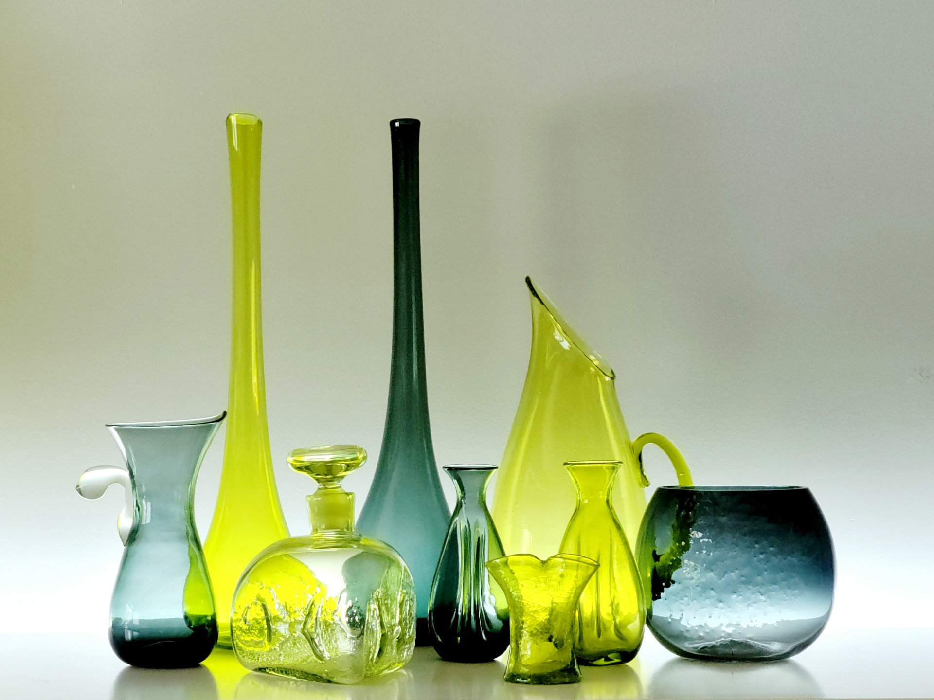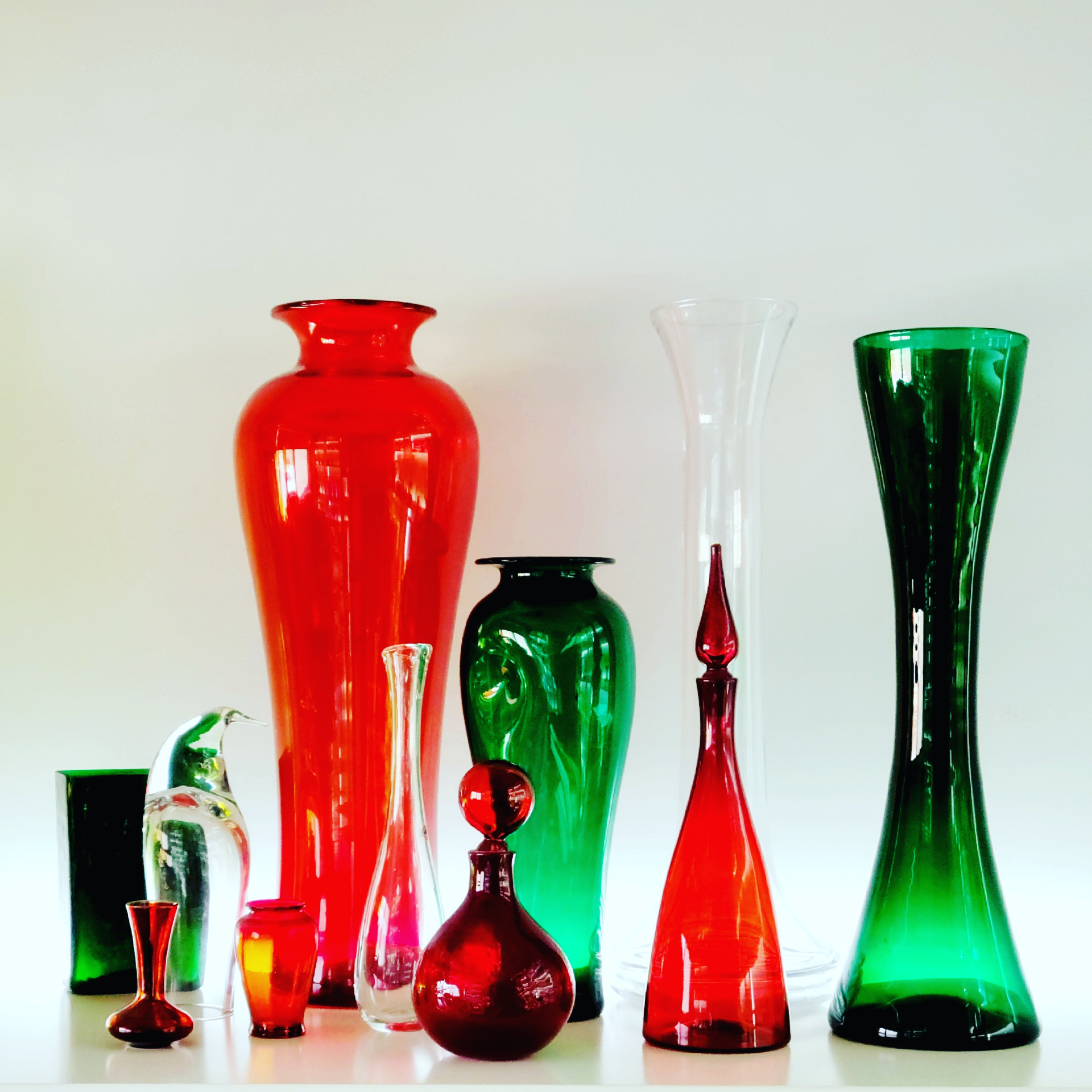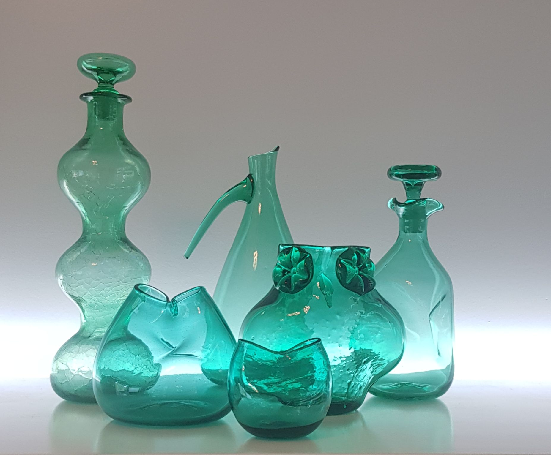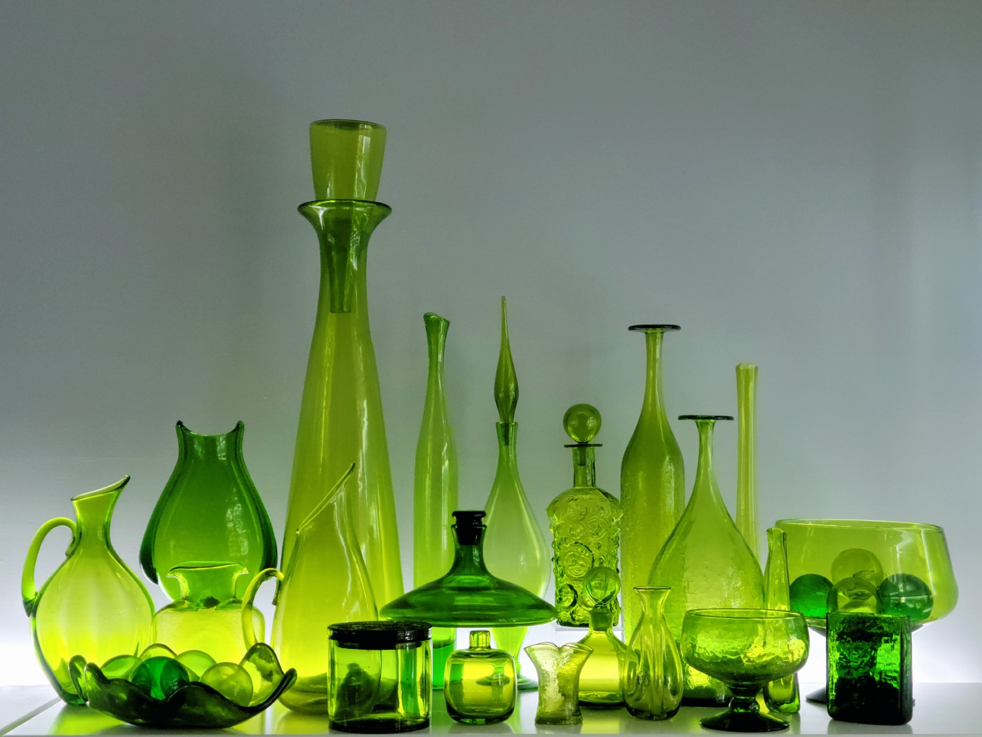 5616c in jade, 715 globe decanter in grass, 5318 vase in lime or jade, 6944 lollipop decanter in pine?, 5618 step vase in clover