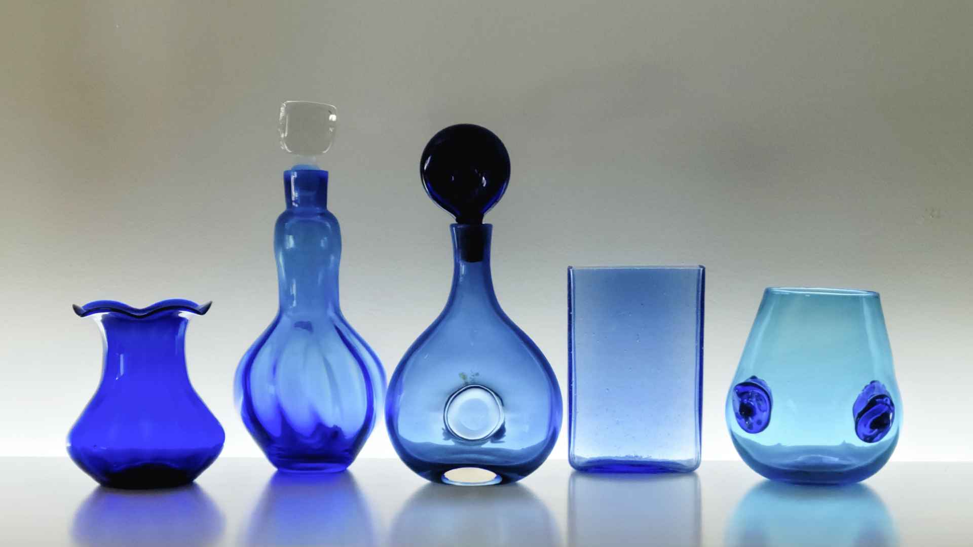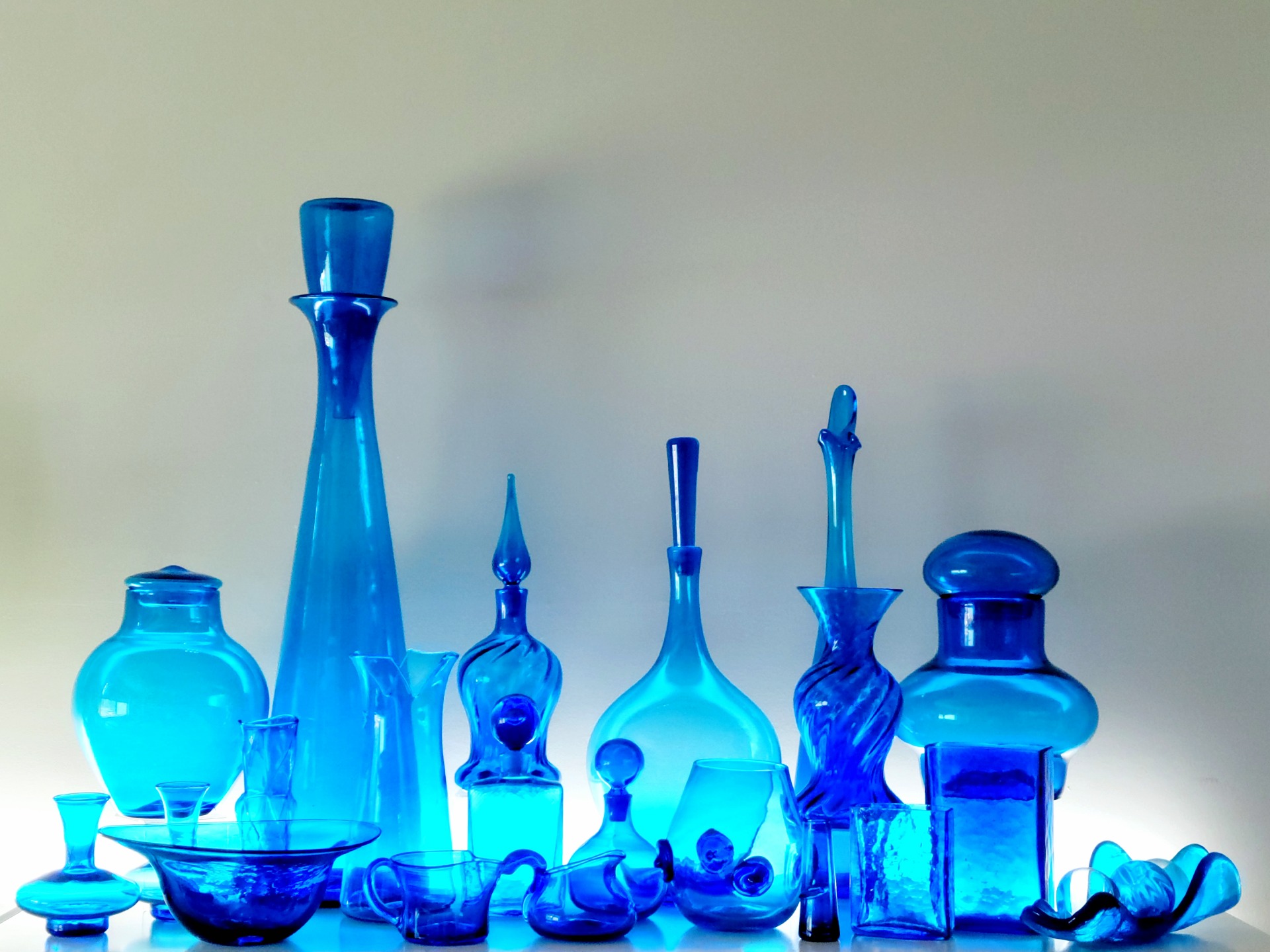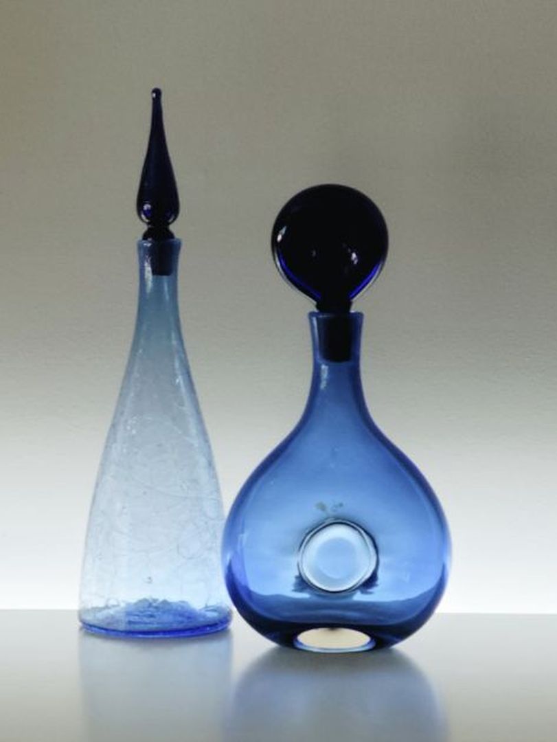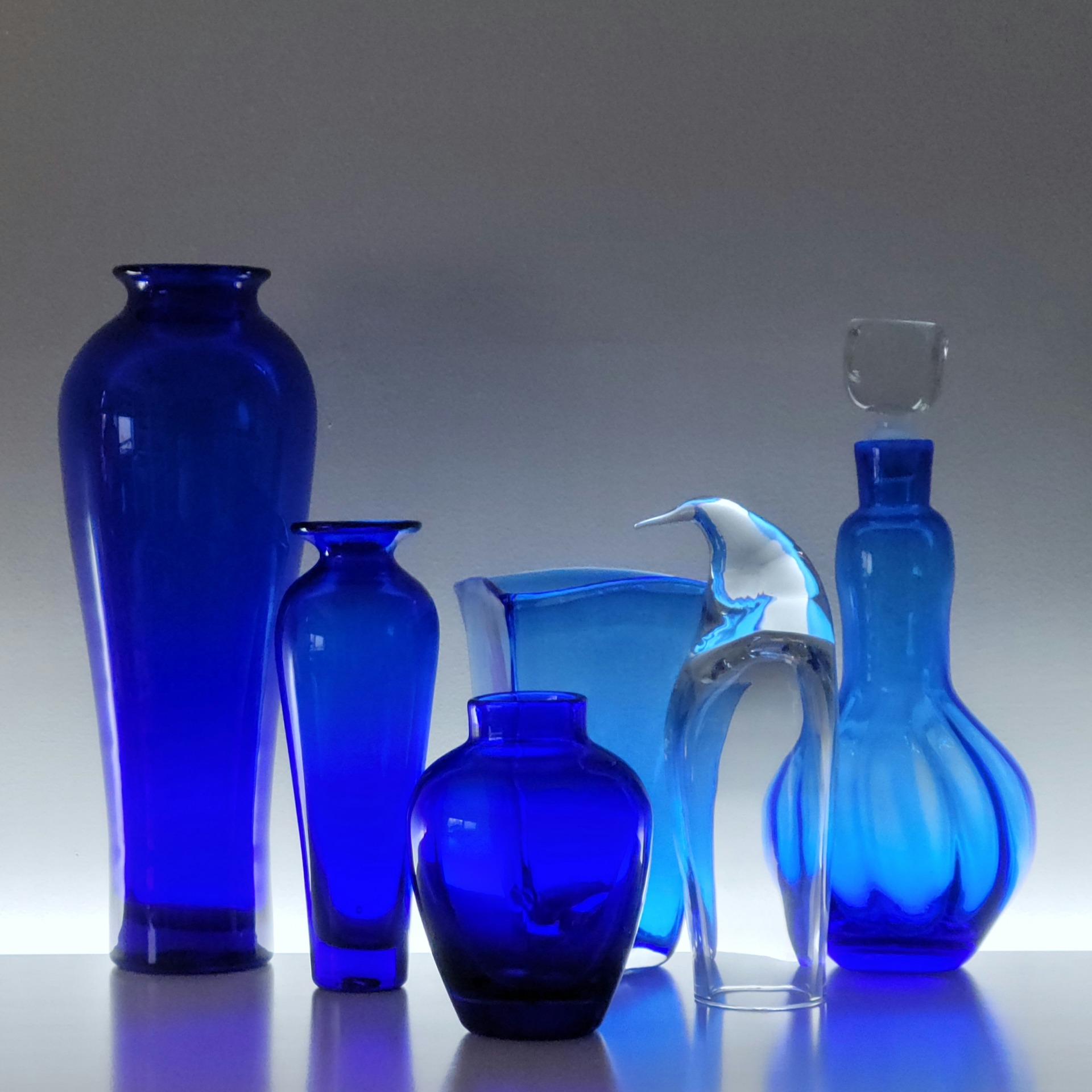 sapphire, cobalt, azure and crystal. back right a visitor center decanter in azure with crystal ice block stopper
